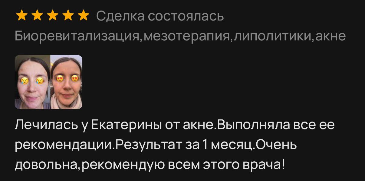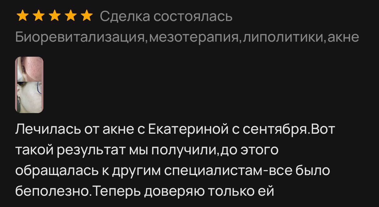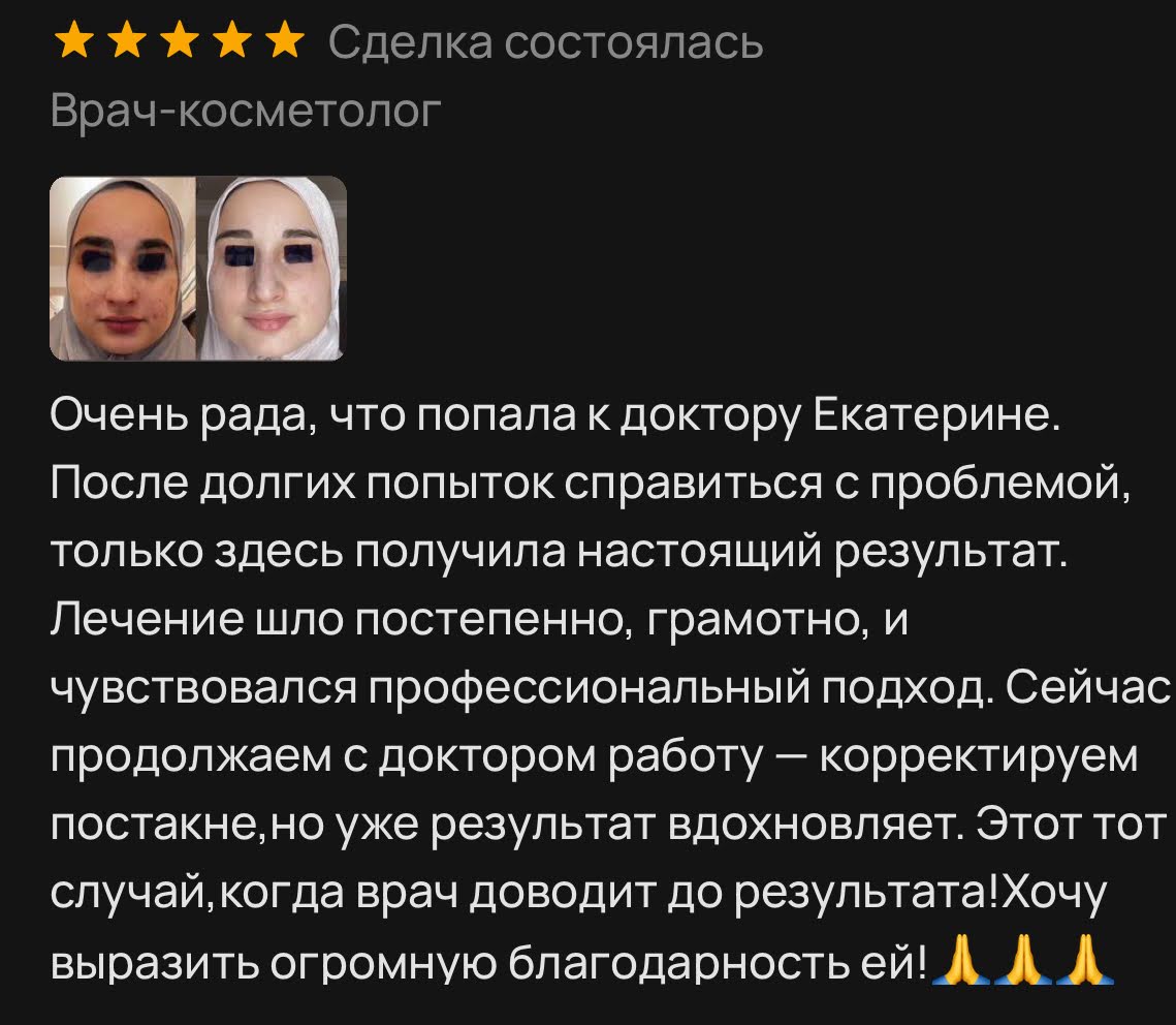 Я считаю, что каждая девушка прекрасна — просто иногда коже нужен правильный план и умелые руки. Поэтому я не работаю “по трендам” и не делаю наугад: вначале мы выстраиваем понятную стратегию, чтобы вы точно понимали, куда мы идём, зачем и в какие сроки ждать изменения. Мой подход — естественно и безопасно: без перегруза, без лишних вмешательств и без “перекачанных” результатов.